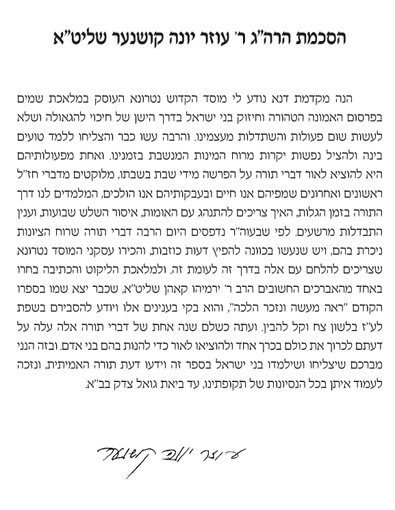 "The holy organization, Natruna, carries out the work of Heaven, to spread pure emunah and strengthen the Jewish people in the time-honored ways of waiting for the redemption and not doing any act towards it on our own. One of their activities has been to publish words of Torah on the weekly parsha. I bless them that they should succeed and teach the Jewish people the true daas Torah through this book."