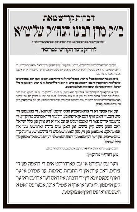 There exists an organization called Natruna [Torah Jews] dedicated to solving this issue. They make it their business, and I want to endorse them publicly. They publicize to the entire world that there are Jews among the Jewish people who are not Zionists and have no connection whatsoever with Zionism. They have no connection whatsoever with the Zionist state, and the Prime Minister mentioned above does not speak in the name of the Jewish people." Complete and official statement in Yiddish